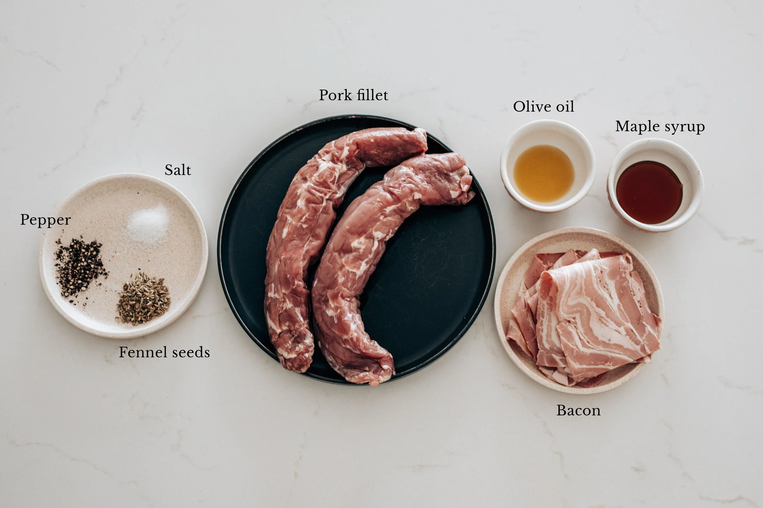 - Preheat the oven to 200°C (180°C fan). Heat a pan with the olive oil over medium-high heat. Sear the pork until the bacon is golden on all sides.