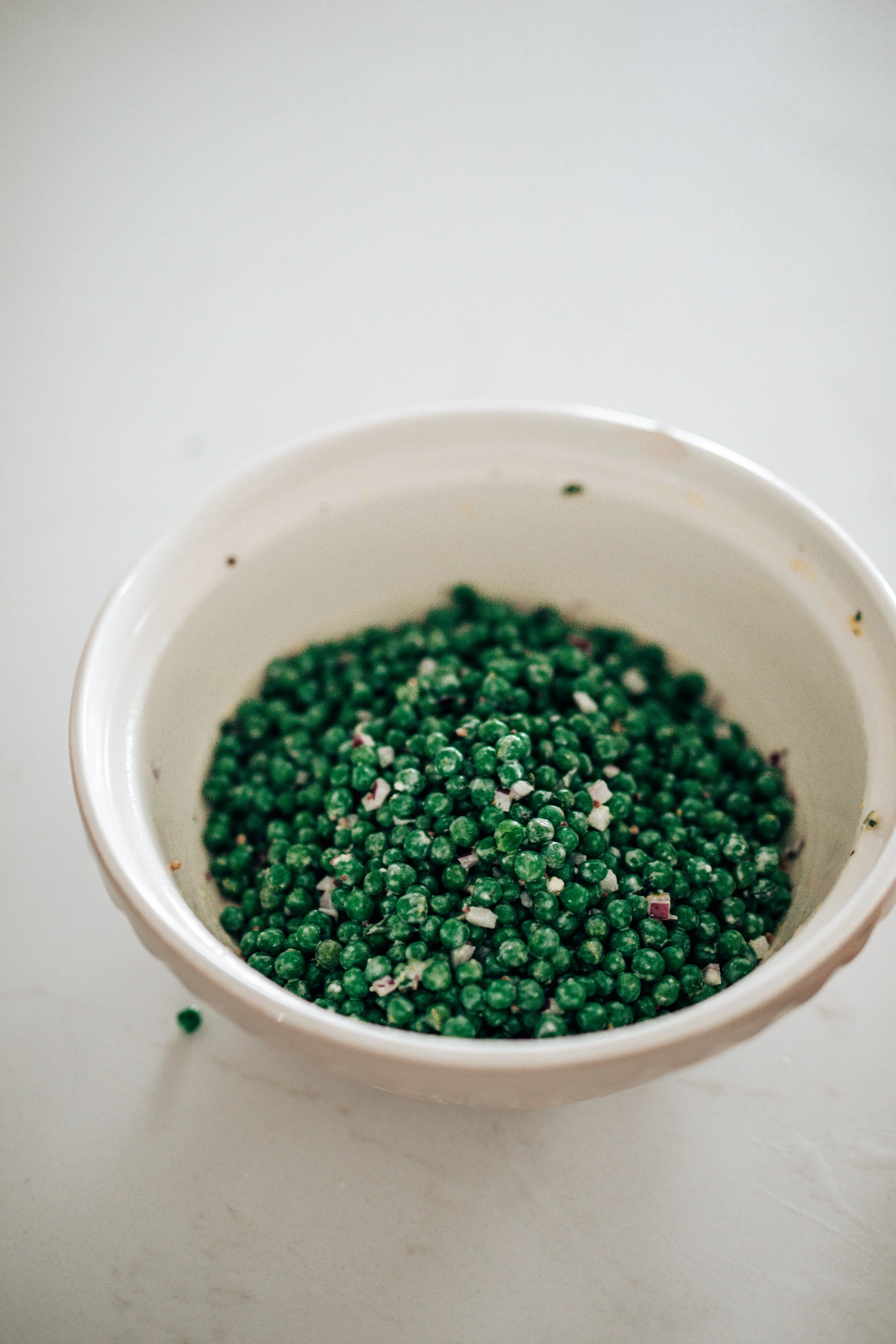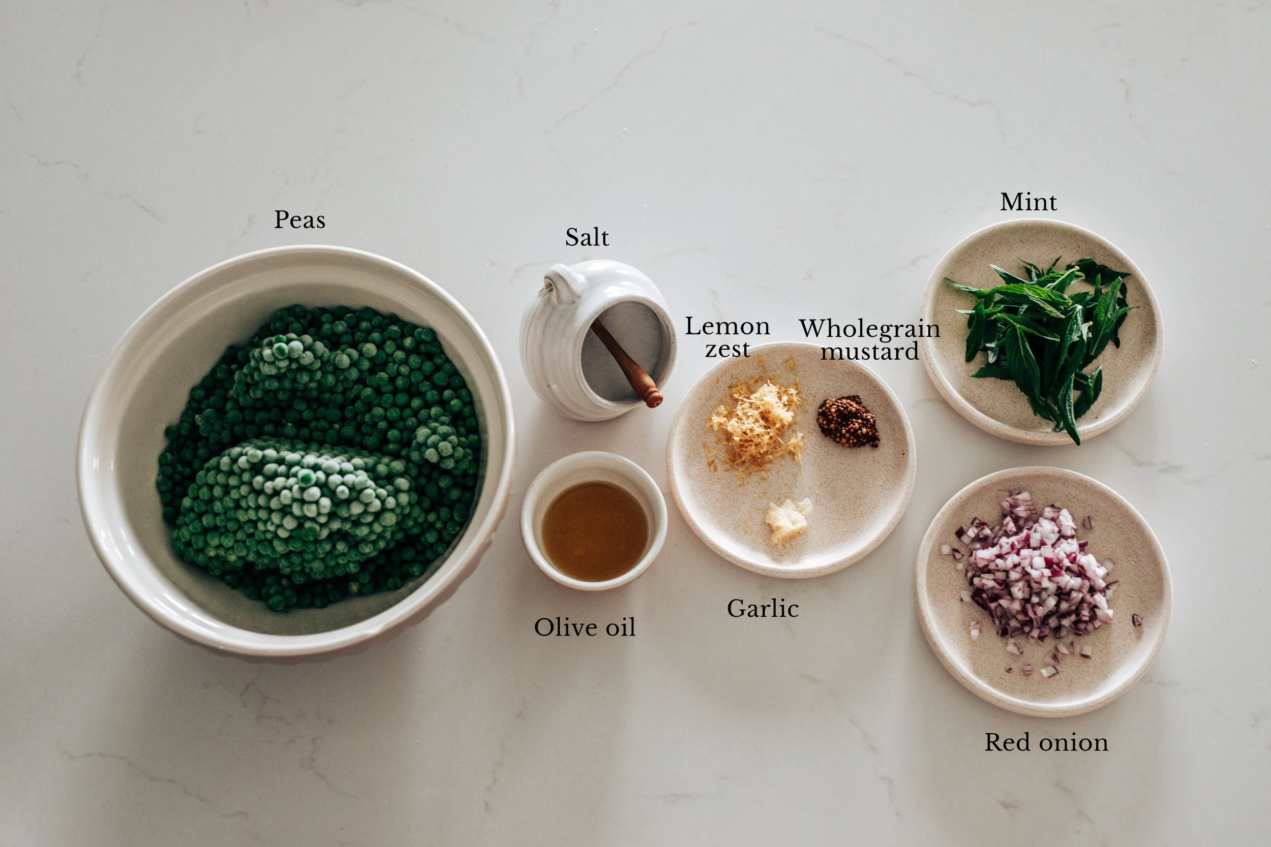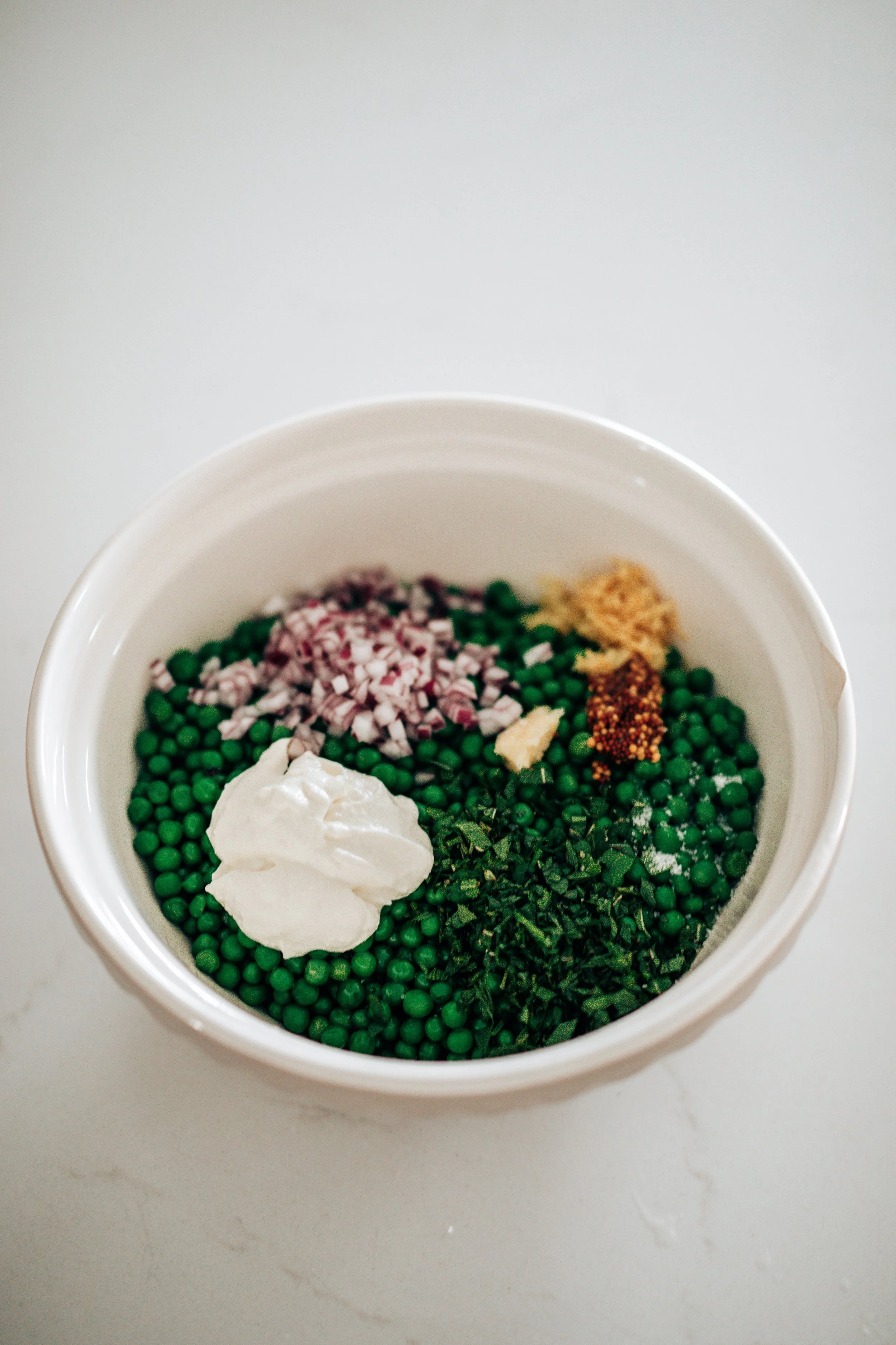 Whole grain mustard adds tiny bursts of tang and texture. It brings complexity without overpowering the freshness of the peas and looks beautiful dotted throughout the salad.