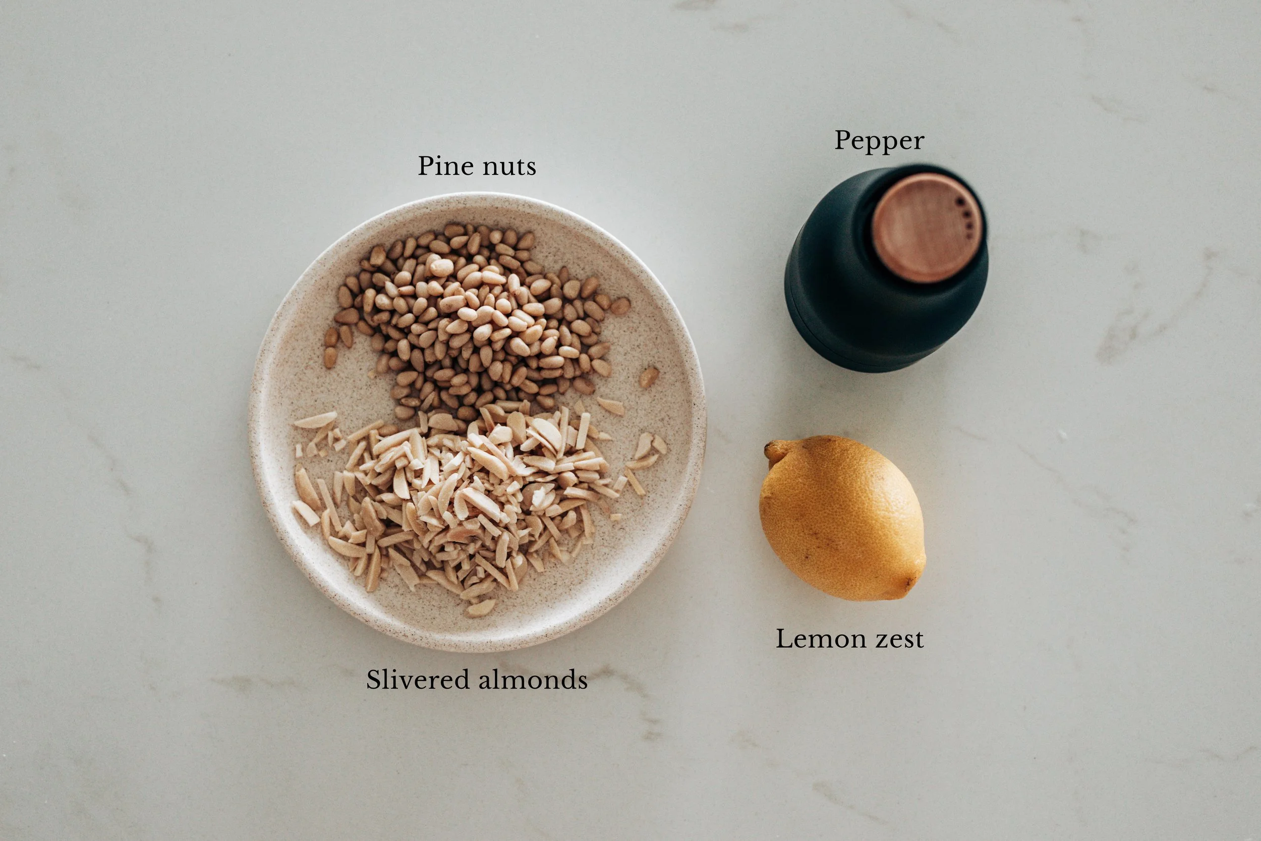 - Scatter with toasted pine nuts and finely diced shallot. Finish with cracked black pepper and extra lemon zest if desired.