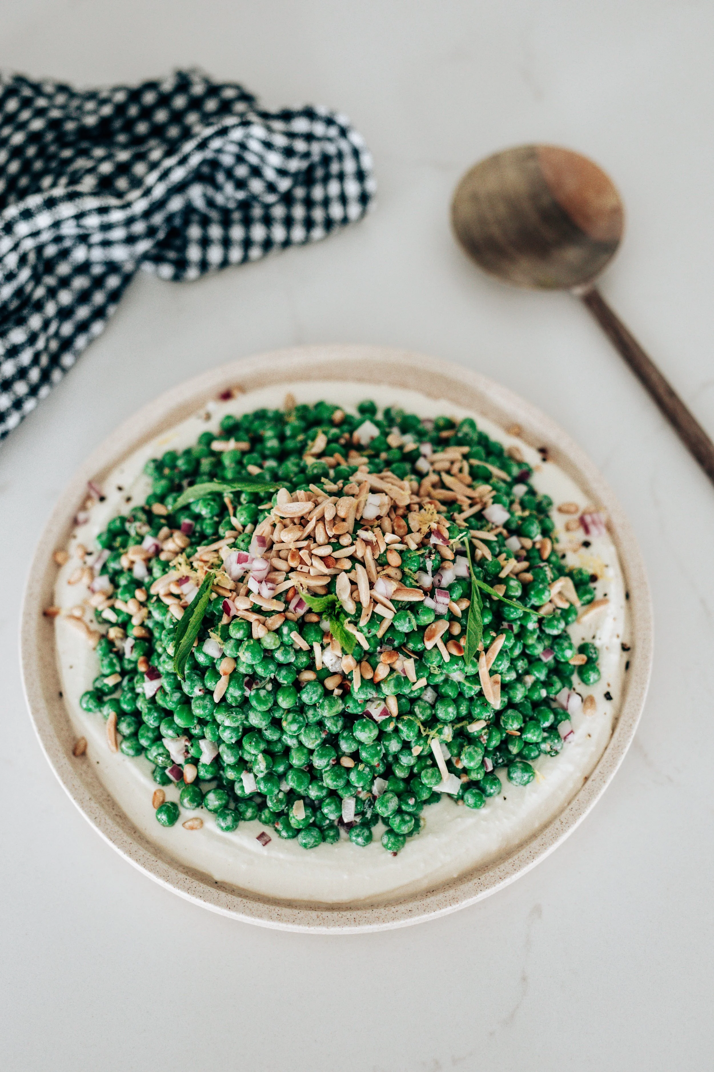 - Spread the whipped feta onto a large serving platter, swooshing with the back of a spoon. Spoon the pea mixture generously over the top.
